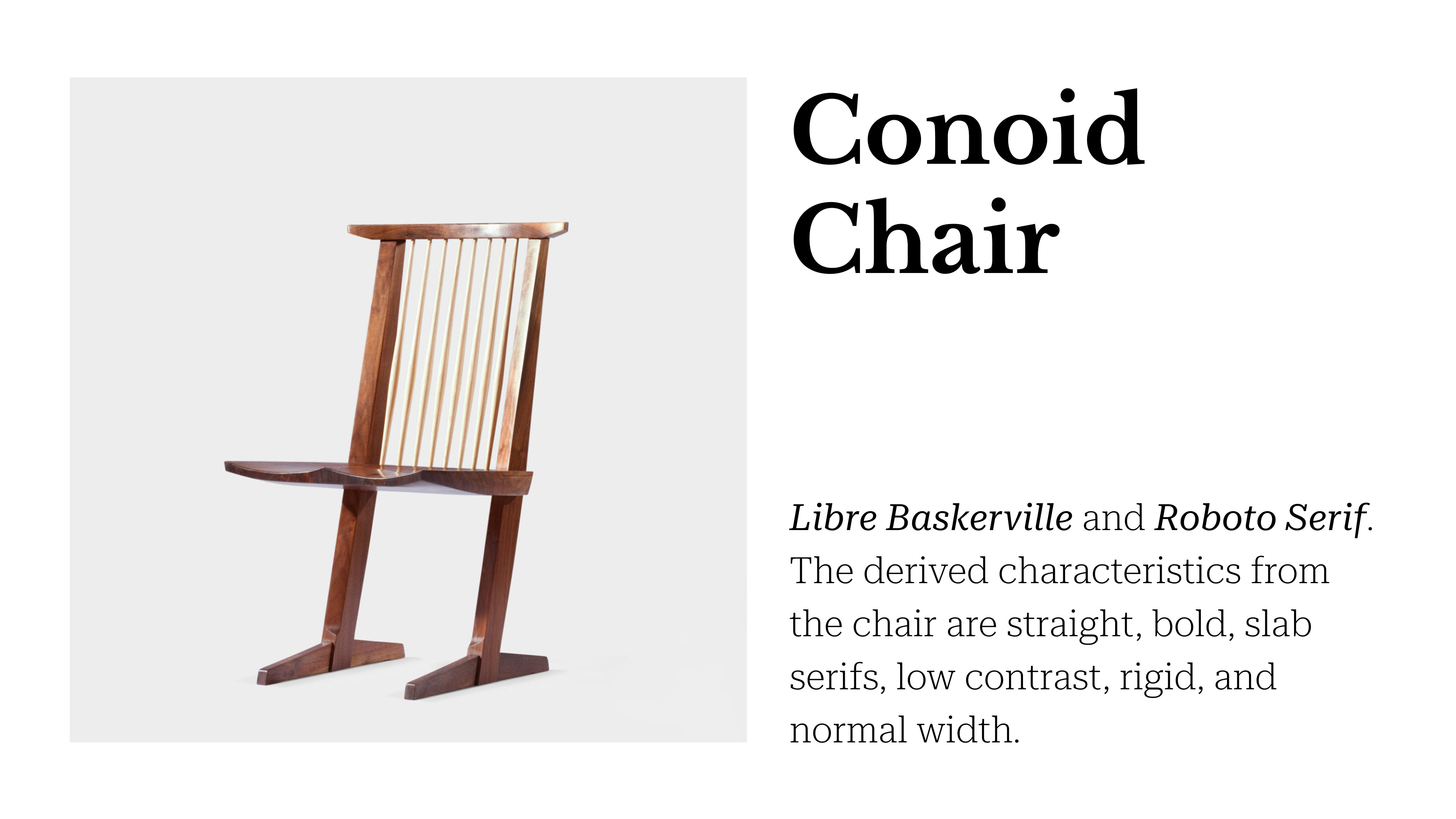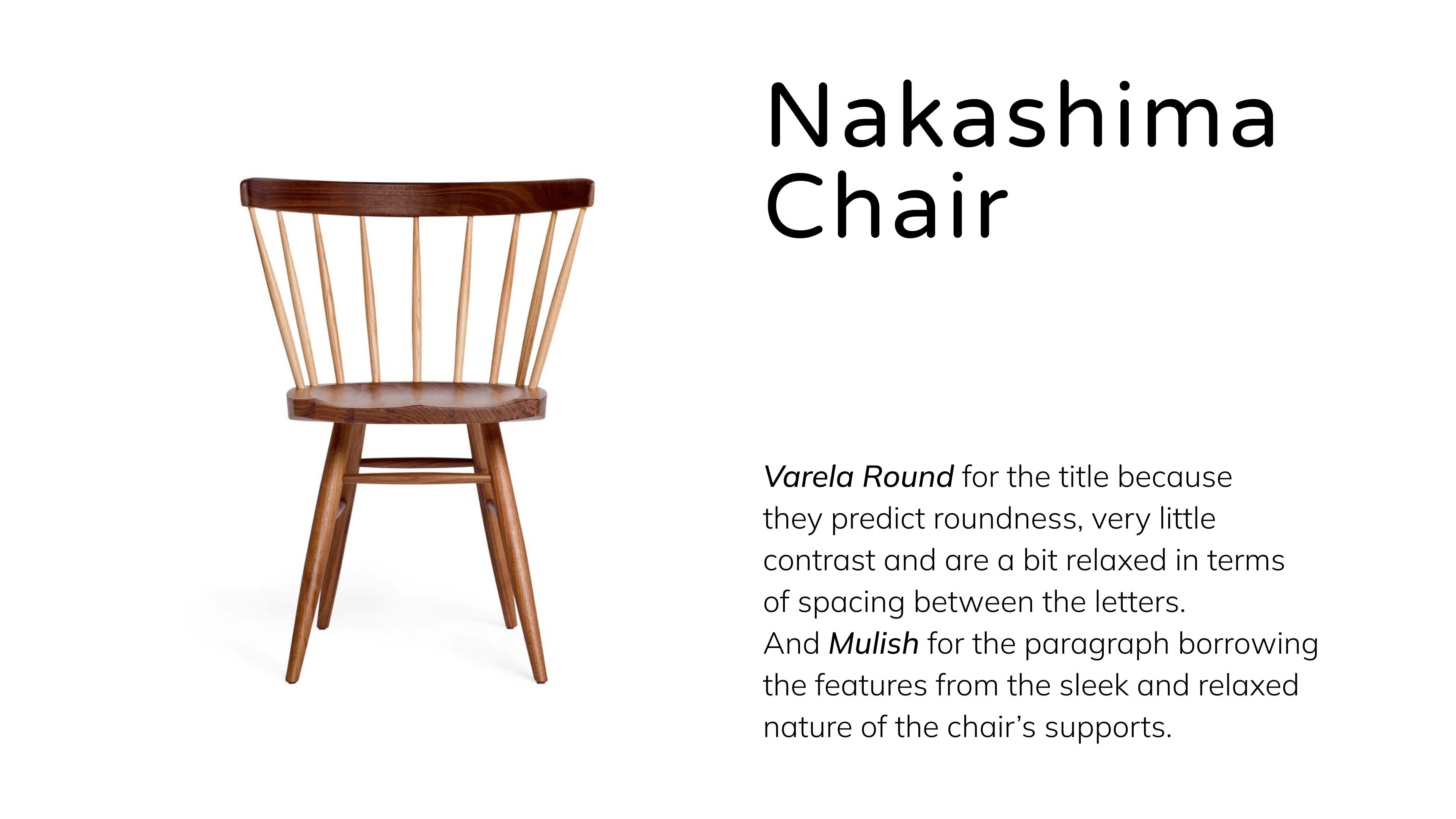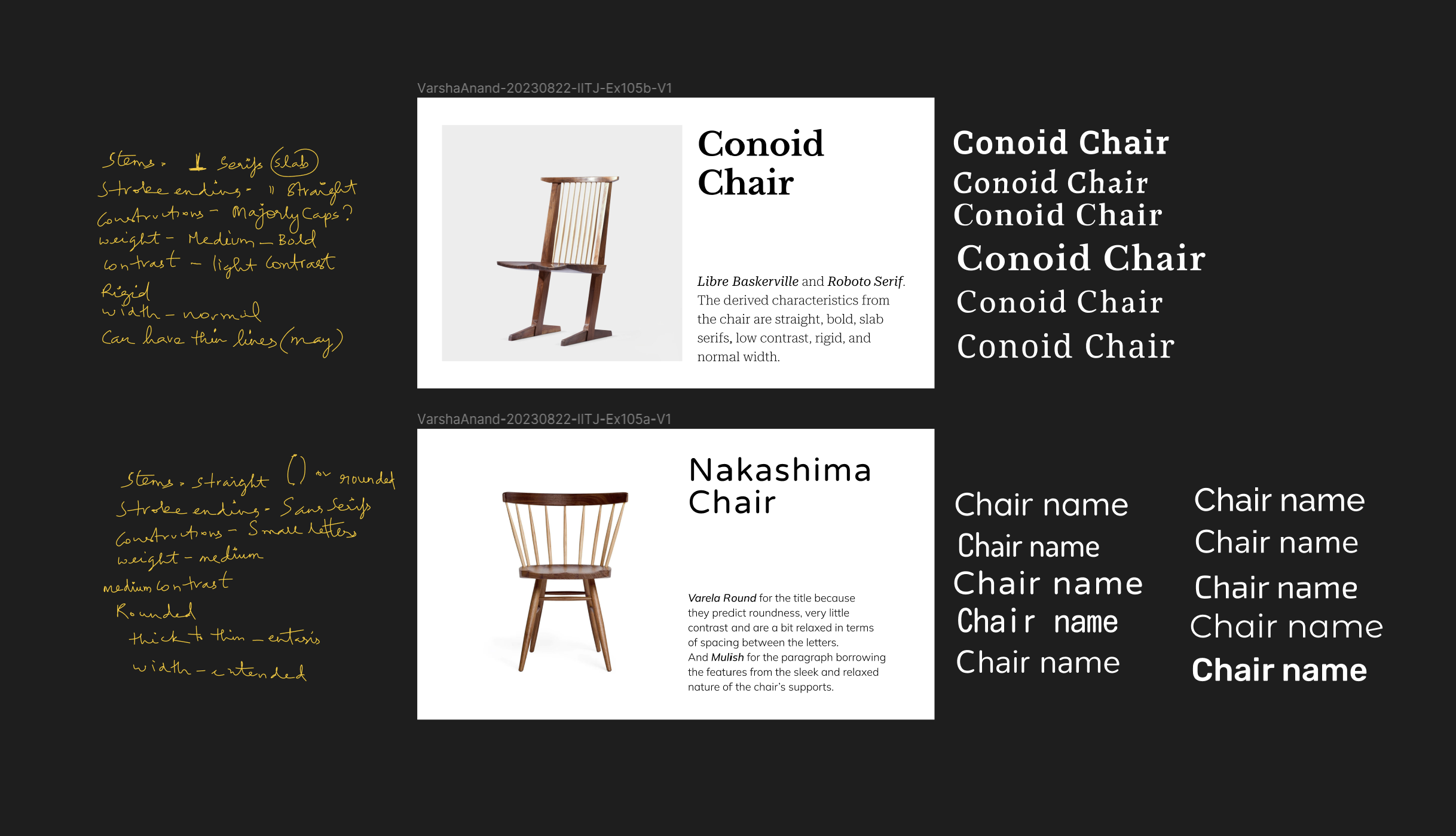 This exercise was really interesting as a whole. We pick two chairs from a given catalog and match them with typefaces that we feel resonate with the feel, look, proportions, weights, etc. of the chosen chair. It got a lot more interesting as I started working on it.